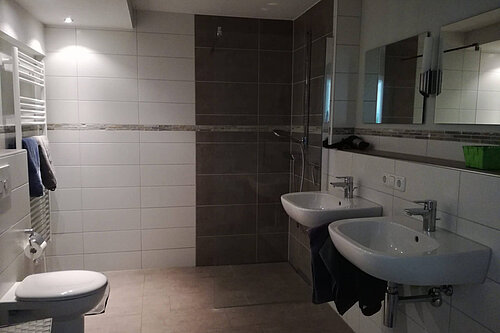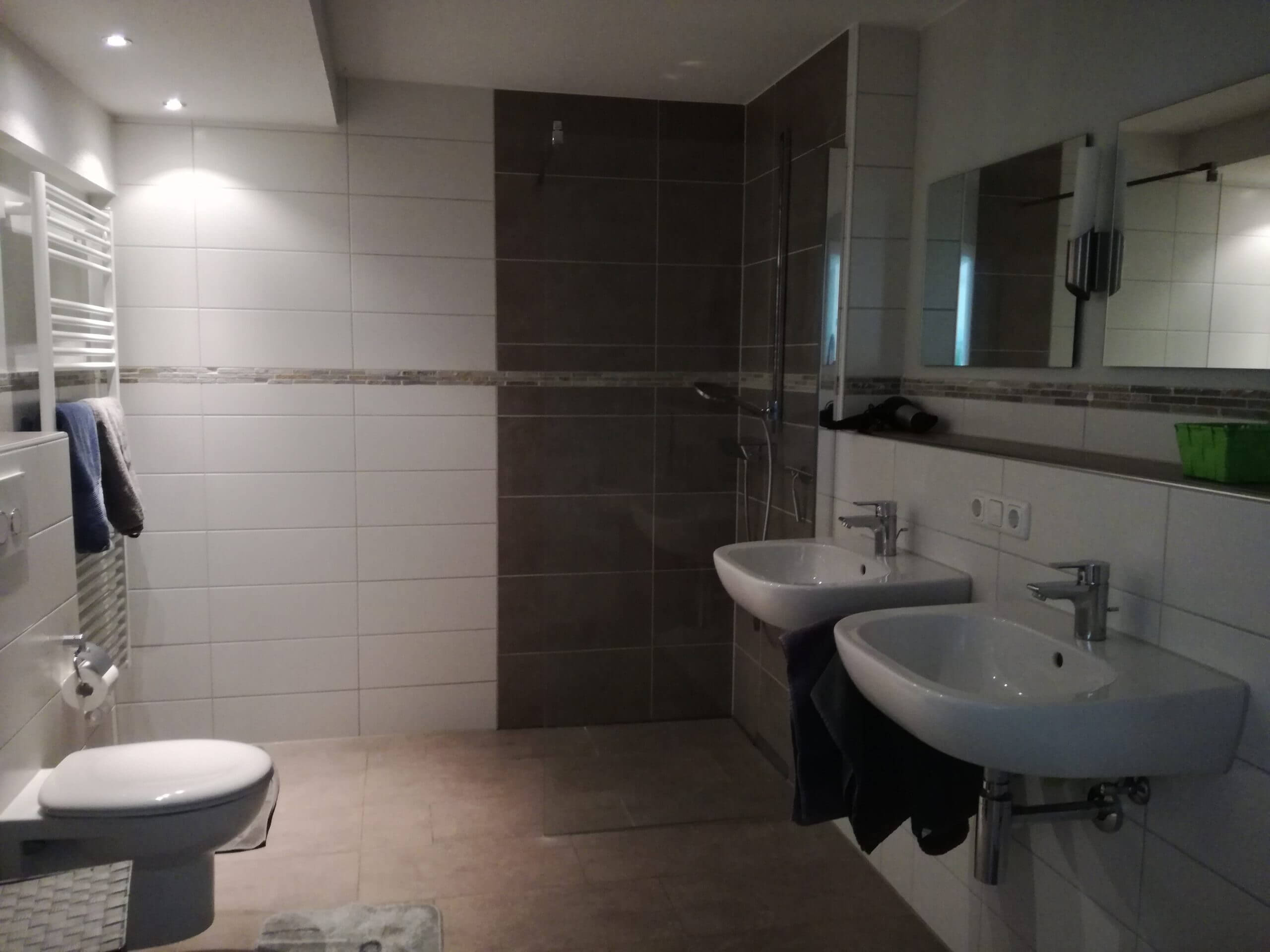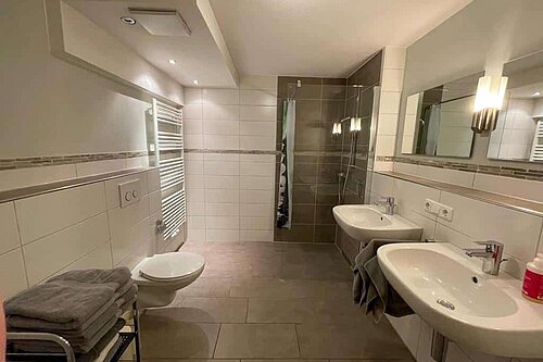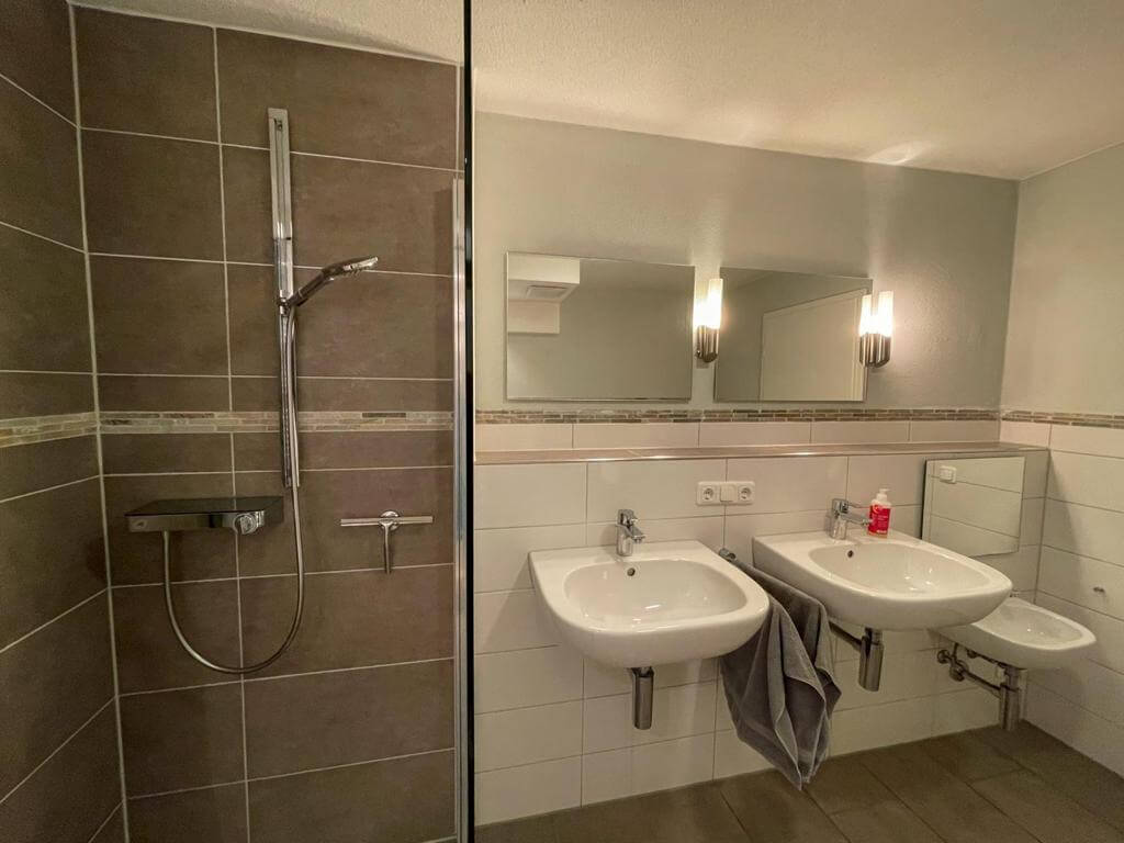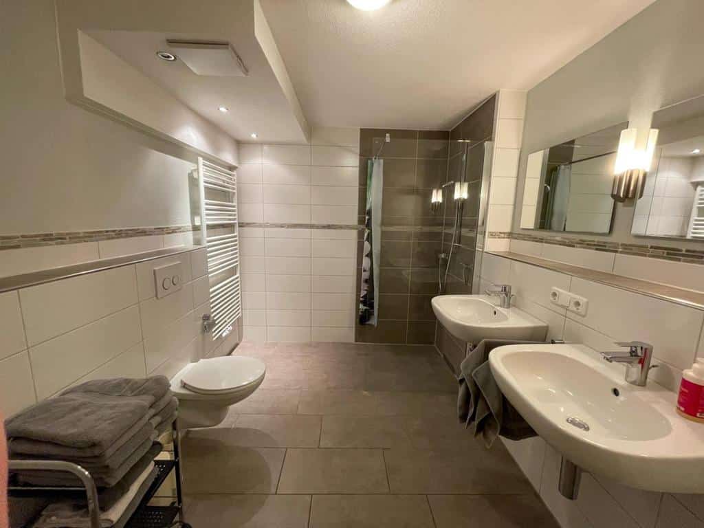 - Badezimmer mit WC/Dusche, separates Kinderwaschbecken, Handtücher, Fön